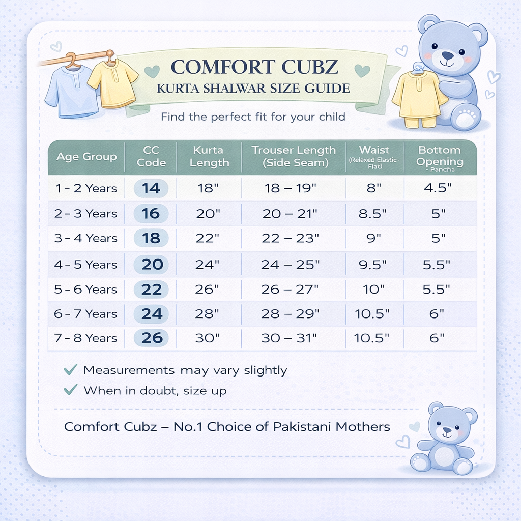 For the best fit, measure your child's height and chest. The kurta features a relaxed fit, and the shalwar has an adjustable drawstring waist for comfort and flexibility as your child grows.