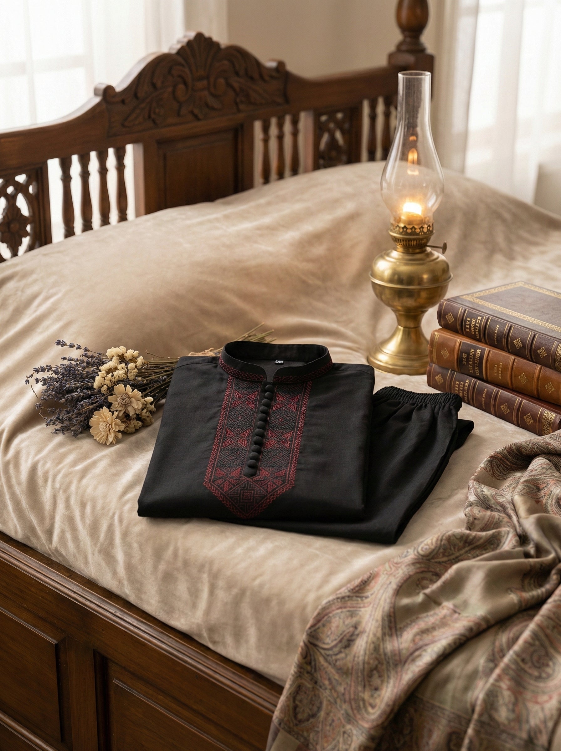This complete set includes a matching black kurta and shalwar for a coordinated, traditional appearance.
